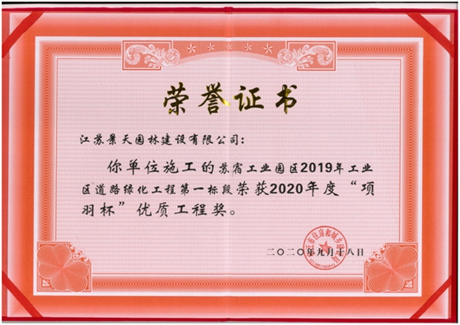 蘇宿工業(yè)園區(qū)2019年工業(yè)區(qū)道路綠化工程榮獲2020年度“項(xiàng)羽杯”優(yōu)質(zhì)工程獎(jiǎng)