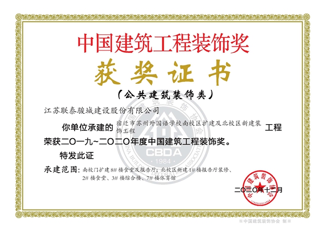 近期,傳來喜訊,由開發(fā)公司代建的宿遷市蘇州外國(guó)語學(xué)校南校區(qū)擴(kuò)建及北校區(qū)新建裝飾工程獲得中國(guó)建筑裝飾行業(yè)最高獎(jiǎng)項(xiàng)“中國(guó)建筑工程裝飾獎(jiǎng)”。