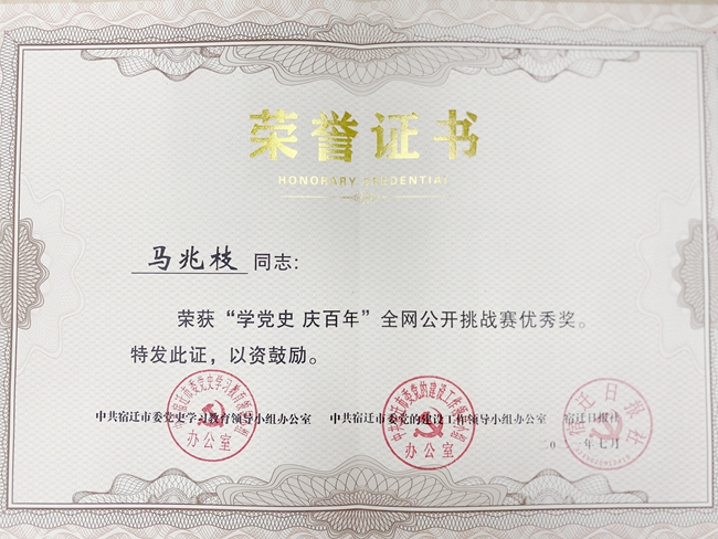 馬兆枝榮獲宿遷市“學(xué)黨史、慶百年”挑戰(zhàn)賽優(yōu)秀獎(jiǎng)