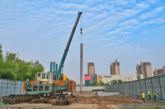 走進(jìn)宿蘇外南北校區(qū)施工現(xiàn)場,映入眼簾的是一片繁忙景象,不僅有忙碌的工人,還有火力全開的機(jī)械設(shè)備。大型機(jī)械臂吊將一根根混凝土方樁移送到樁機(jī)上,大型樁機(jī)猶如鋼鐵堡壘般高高屹立,從早上6點到晚上10點,壓力器不停地將混凝土方樁“打”入20多米深的地下,本項目總約300根樁,主要采用靜壓法沉樁工藝,樁體平均長度21米,每根樁施工約1小時。