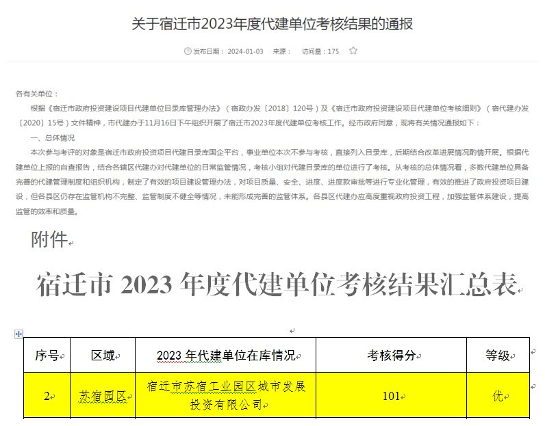 近日,經(jīng)市政府同意,由宿遷市政府投資建設(shè)項(xiàng)目代建管理辦公室通報(bào)宿遷市2023年度代建單位考核工作結(jié)果,城發(fā)公司以101分高分通過(guò)本次考核。