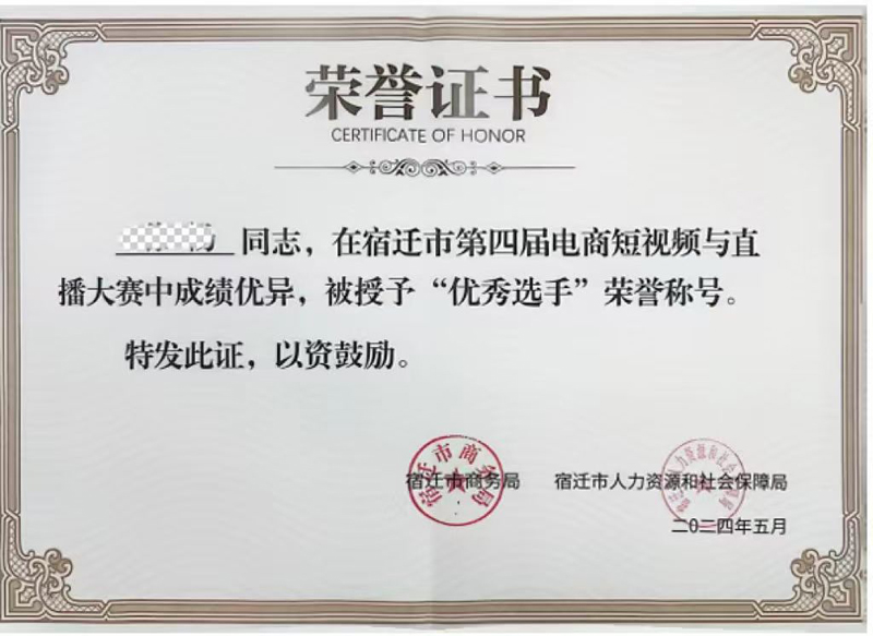 榮譽證書得獲得不僅是對參賽選手個人努力和才華的認可,也是對蘇宿電商園在電商領域專業(yè)人才培養(yǎng)和推動電商直播行業(yè)發(fā)展的成果的肯定。