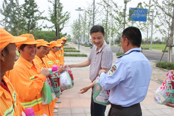 在慰問(wèn)現(xiàn)場(chǎng),許紹杰與城市維護(hù)工人親切交談,詢問(wèn)他們的身體狀況以及高溫天氣工作、生活情況,叮囑大家在夏季高溫時(shí)段要注意休息,勞逸結(jié)合,防止高溫中暑。溫暖的話語(yǔ)讓大家深切感受到黨的關(guān)懷和溫暖,紛紛表示要繼續(xù)發(fā)揚(yáng)“不怕苦、不怕累、不怕臟”的精神,把園區(qū)城市維護(hù)工作做得更好。
